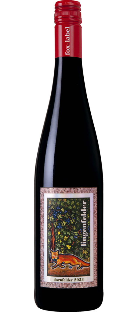 A quick flash of red in a German vineyard. Although Germany is best known for its white wines, there is a long tradition of making red wine in Germany. There is also a long tradition of little foxes making their homes in the gentle slopes of the vineyard hills. Dornfelder is an easy to drink, easy to enjoy red wine that pairs beautifully with a wide range of cuisines. Vineyard foxes like to hide amongst the wooden vines, but the Dornfelder grapes that grow above them are best enjoyed without a covering of wood. With this in mind, we have crafted this wine to display clear, distinct fruit characteristics, without excessive oak flavours that tend to cloud and disguise a wine’s character. The label depicts our little fox, emerging from the cover of wood to reveal himself as a beautiful – and uniquely red – member of the vineyard creatures community.